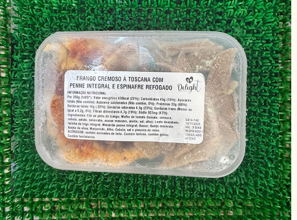 Frango cremoso a toscana com penne integral e espinafre salteado
